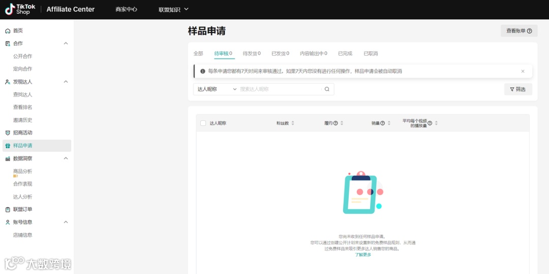 商家可以在样品申请界面审核样品、监控样品的履约进度。通过审核的样品,会自动并入商家后台的订单发货。