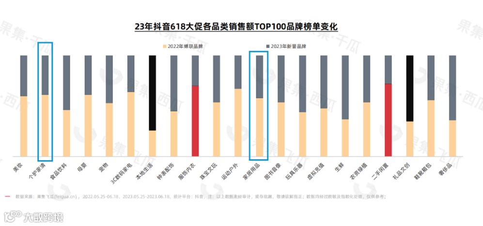 对比2022年618的品牌数据,2023年各行业百强品牌更替率均超过45%,赛道竞争日趋白热化。新晋品牌来势汹汹,头部品牌竞争激烈。