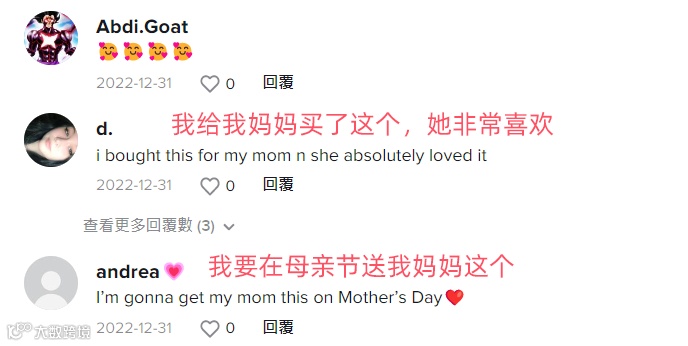 视频通过精美的首饰盒吸引用户停留观看,从而将重点转移到项链上,并对项链本身的卖点进行详细的介绍。由于项链本身的设计聚焦在“mom”上,使得受众群体更加清晰,评论区中不乏有用户表示自己已下单,或打算下单,准备送给自己的母亲作为礼物。