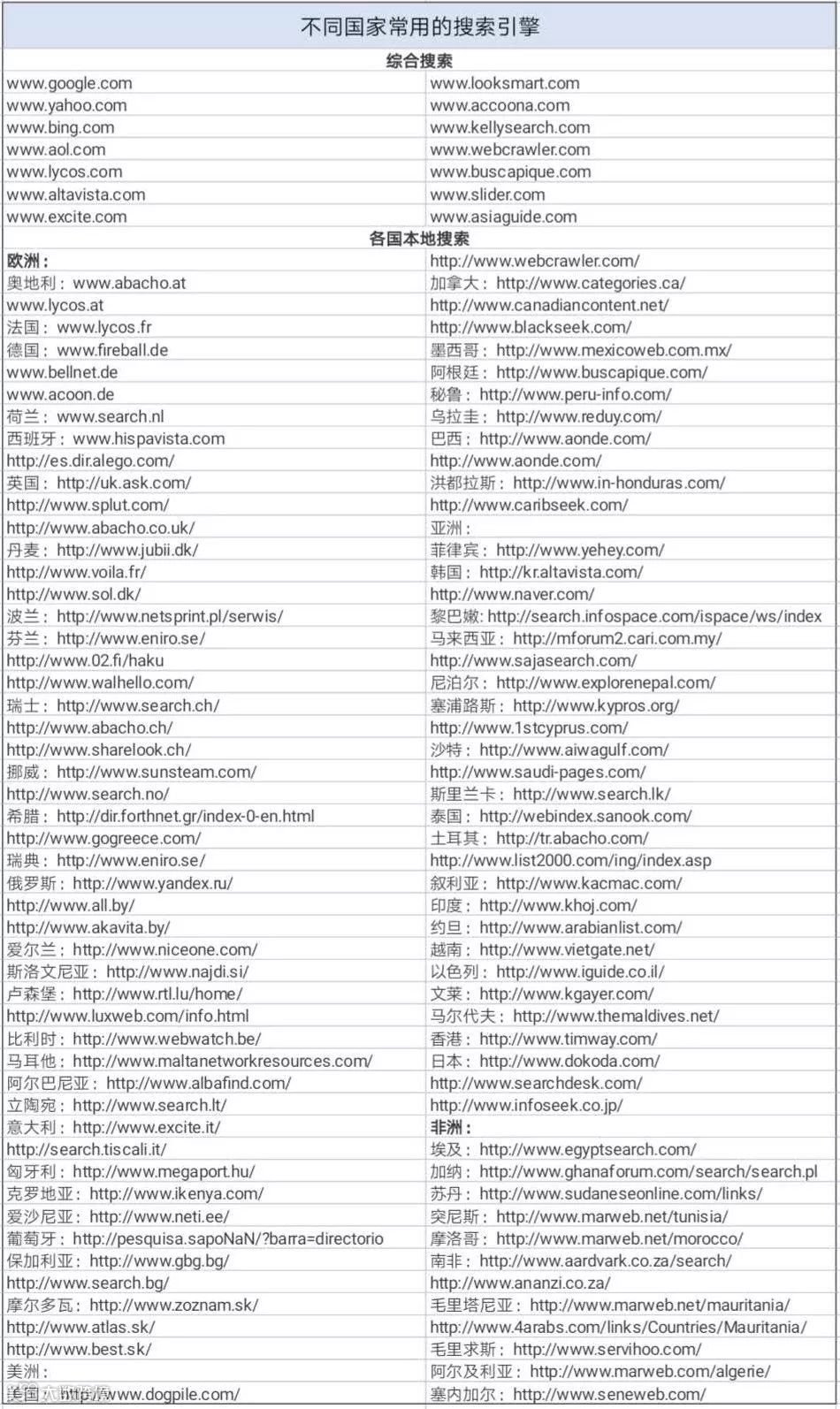 以下为不同国家常用的搜索引擎列表: