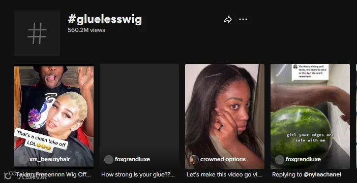 无胶假发是 TikTok 用户较为关注的一个话题趋势。无胶假发是一种不需要胶水或粘性的假发产品,通常适用于蕾丝假发或正面全蕾丝假发,优势是容易佩戴,肉眼看起来更加真实。在 TikTok 上,此类视频用户的讨论热度极高,其话题 #GluelessWig 等浏览量已高达 5.6+ 亿次。