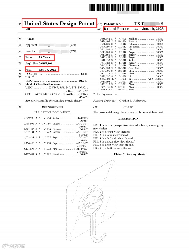 美国专利商标局uspto查询显示,该产品在美国已经申请外观设计专利,申请时间并没有多久,为去年10月26日,注册时间是今年1月10日,专利有效期是15年。