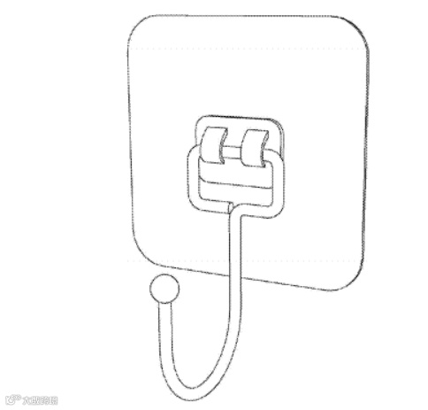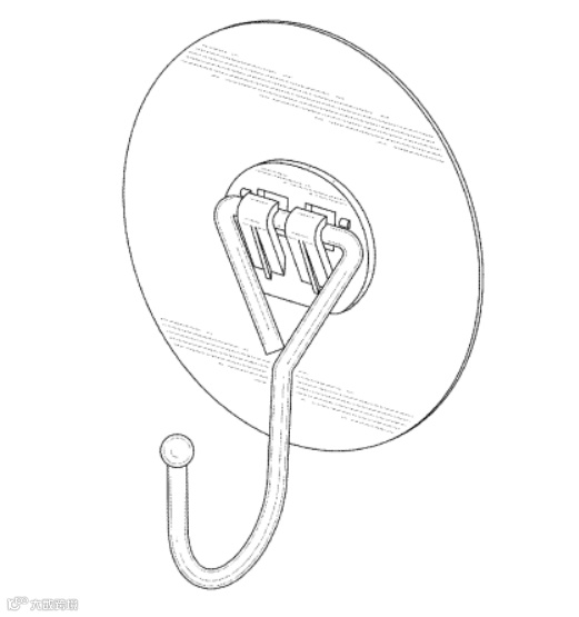 从其设计图可以看到,该产品的设计风格较为简易:一块边角圆滑的四方形粘贴板,中间是一个圆形的固定板,挂钩则是从中间分开成了两股。如下图所示:
