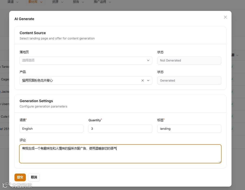 2.点击“AI生成”,选择你刚刚创建的产品。同时,如果你对广告内容有要求,也可以输入相关要求,点击“提交”即可生成