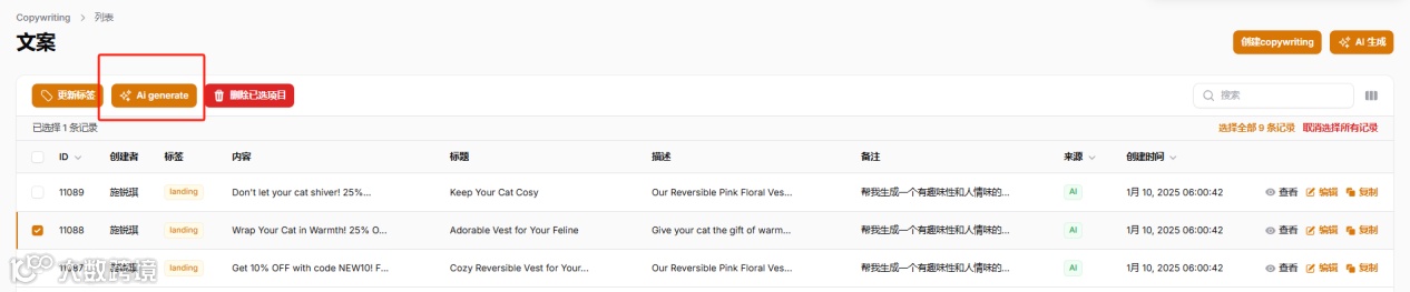 3、在生成的3条文案中,如果你有比较满意的文案,你还可以选中该条文案,系统可以帮你基于原来的文案生成新的文案,只需点击“AI generate”即可