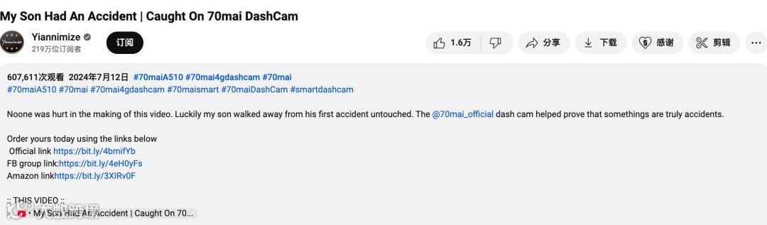 另外,结合视频简介处出现的真心话(幸运的是,制作这段视频时没有人受伤,我的儿子在第一次事故中安然无恙。@70mai_official 行车记录仪帮助证明某些事情只是一场意外),这对70mai的品牌形象做了巨大的正面提升。