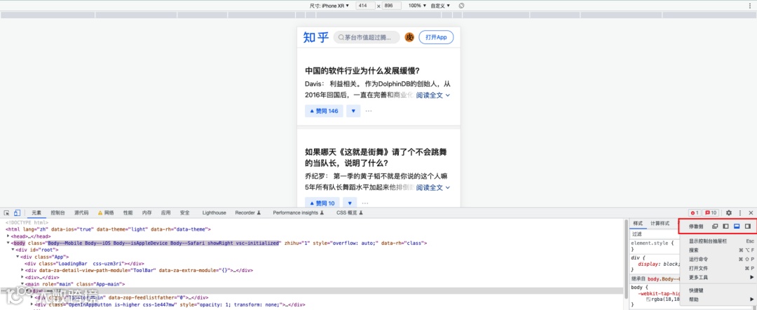 打开Chrome DevTools,然后点击“显示设备工具栏”按钮,就可以切换不同的设备,不同的尺寸信息了。弹出的控制栏也是可以调整停靠位置的,可以放在下方,也可以放在右方。