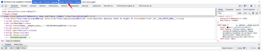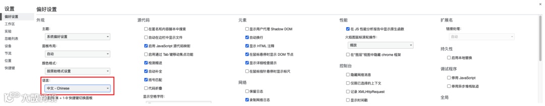 目前的Chrome DevTools支持中文了,对于一些英文不好或者恐惧技术术语的朋友,可以试着切换一下中文版看看。如果找不到这个弹出的提示,可以找到右边的“设置”按钮,然后进入设置界面,修改语言。接下来的示意图我都会用中文来演示,方便大家理解。