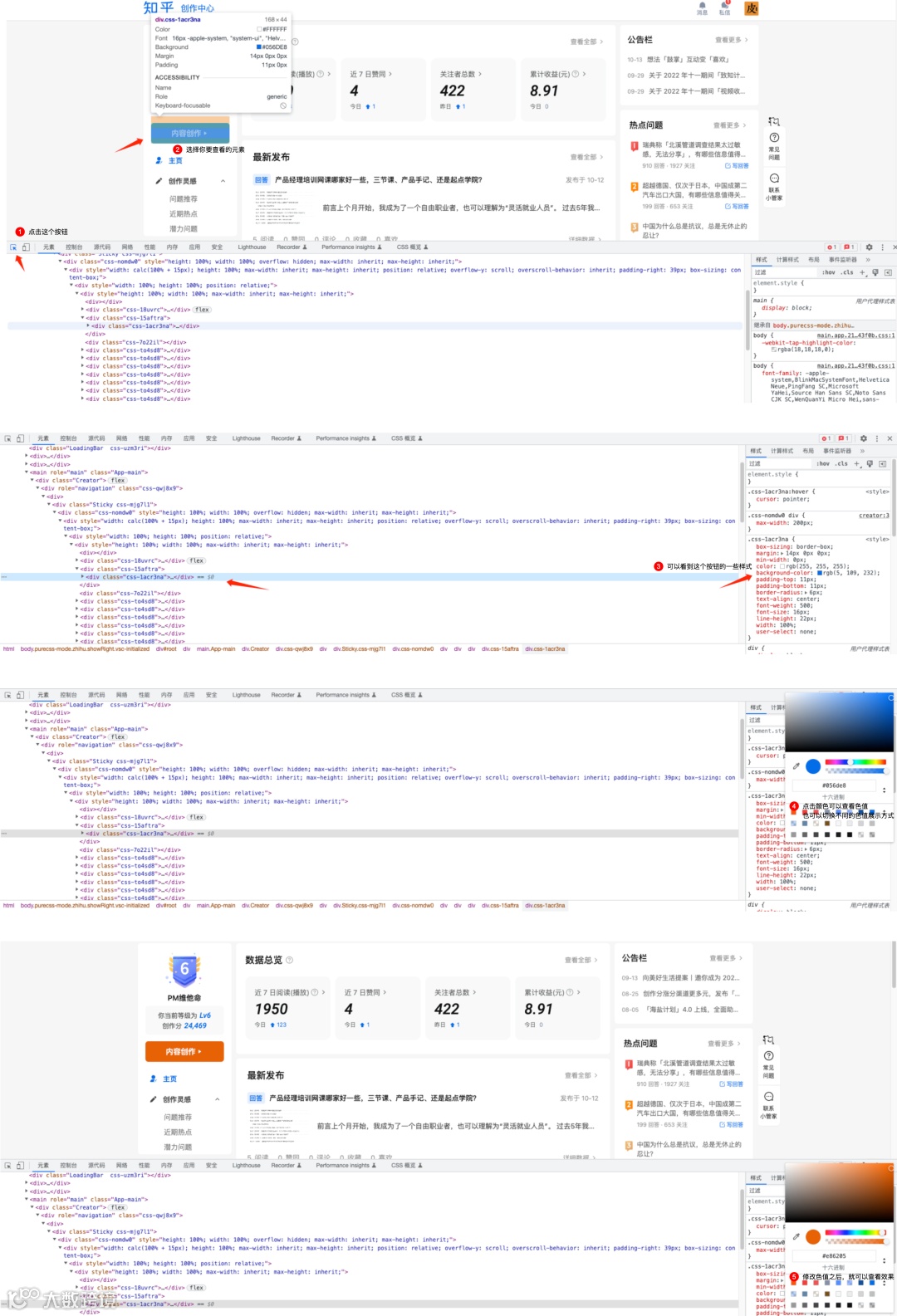 除了可以查看颜色之外,还可以查看圆角,边框粗细,边框颜色,边距,高度,宽度等各种值,想要什么就选择某个元素,然后右侧查看它的样式即可。