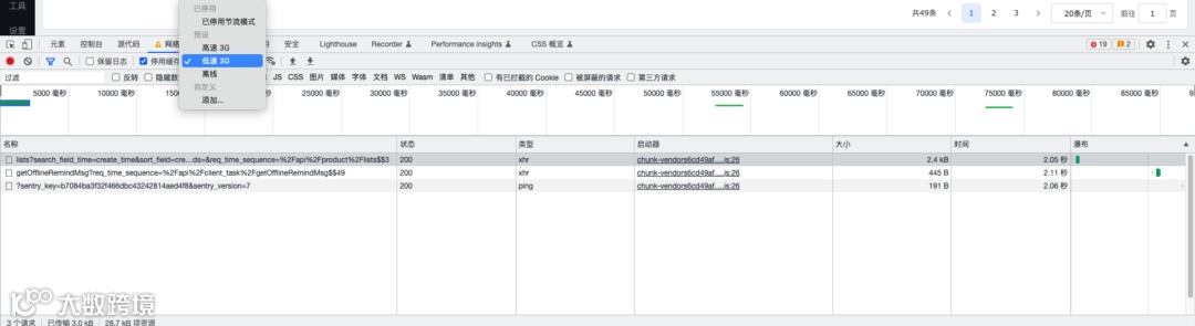 还可以设置网络模拟情况,在高速网络和低速网络的时候是怎么加载的,速度大概怎么样,以此确定是否要做加速或者优化。