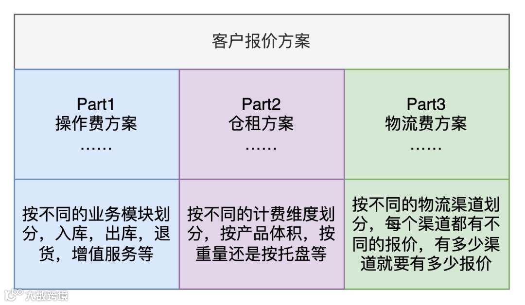 客户报价方案中除了有计费模块之外,还有仓库,客户,物流渠道等信息。
