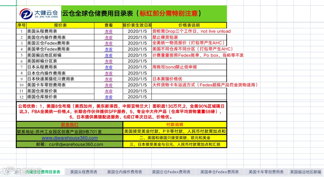当客户需要使用海外仓服务时,会向海外仓的业务人员咨询一份报价表,用来浏览海外仓各项服务内容的价格,这种报价表一般都是用Excel来制作的,类似于这样的。