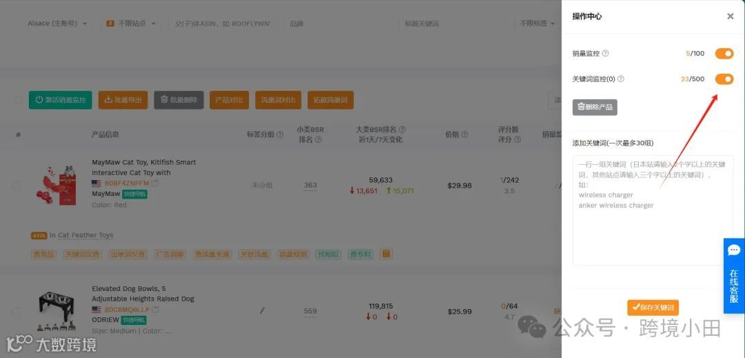 3. 打开关键词监控开关,添加并保存相应关键词。