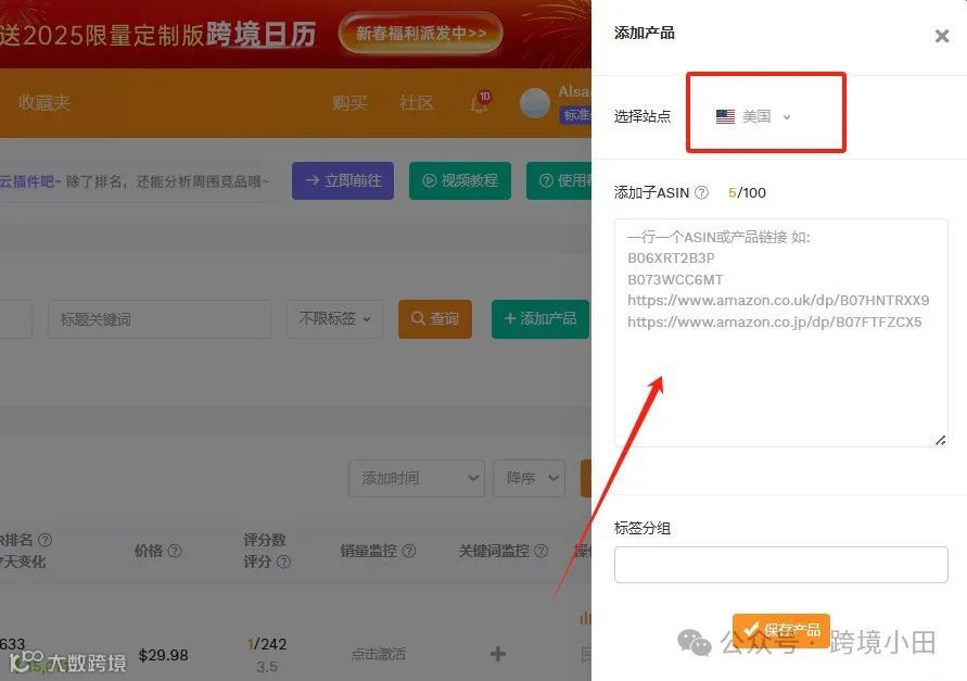 1. 在产品监控板块,先添加要监控的产品。可以选择站点,直接添加产品ASIN,或复制产品链接添加。如果有一类产品,可以进行标签分组。