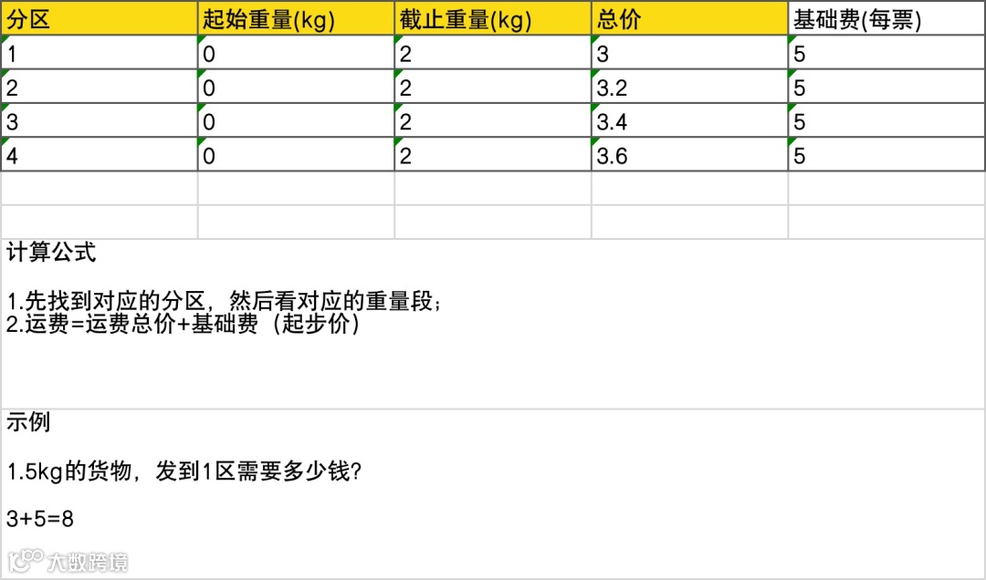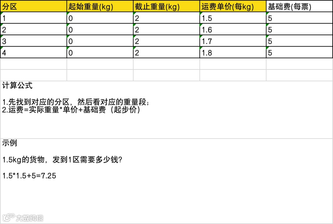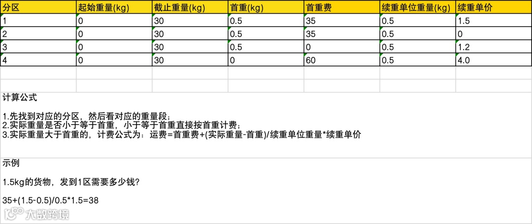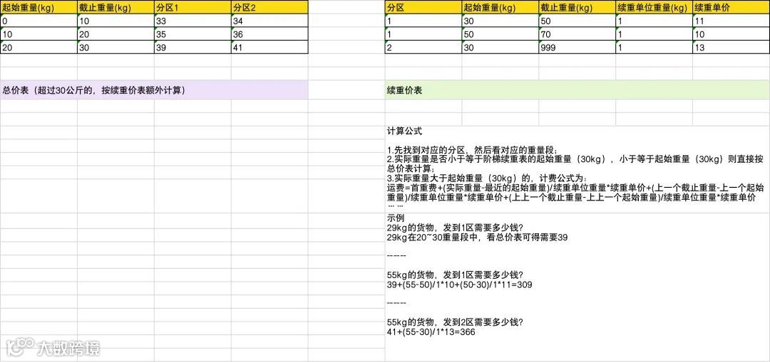 运费报价表基本上每家都不太一样,因为不同的物流商或者是相同的物流商的不同服务类型会有不同的计算方式,所以报价表展现的也就不一样。但是经过大量的比对、分析、调研之后,我大概总结了一下市面上常见的报价表一般会有这么几种计费模式。