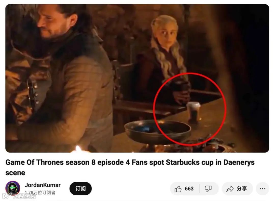 比如,2019年的美剧《权力的游戏》出现了一个穿帮镜头:中世纪风格的背景下,龙女王的餐桌上竟然不合时宜地出现了一杯星巴克。这并不是一次“失误”,而是星巴克一次设计精巧的隐性营销:这一穿帮镜头被剧组大方承认,在线上的社交媒体和线下的各大综艺节目都引起了火热的讨论和恶搞,一时间为星巴克带来了极高的社交热度。