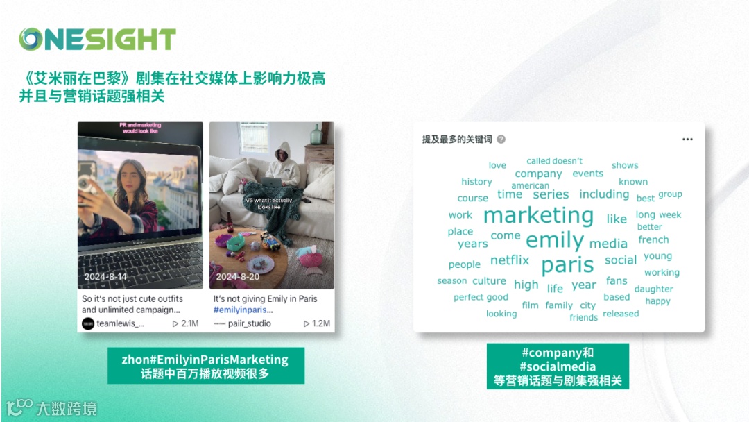 通过 OneSight 的舆情功能我们观察到,与#EmilyinParis和 #EmilyinParisMarketing 相关的话题在 TikTok 上轻松诞生数条百万播放的视频,同时 #company 和 #socialmedia 等与营销相关的词汇也出现在其提及最多的关键词中。