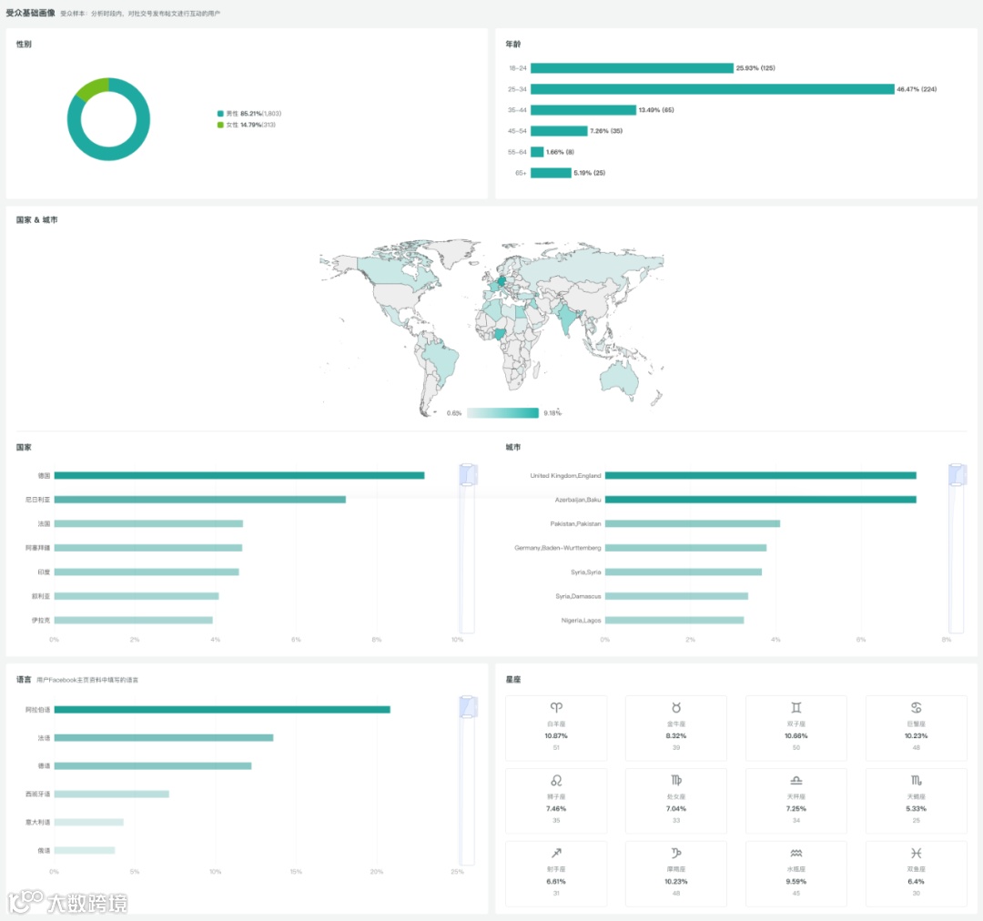 OneSight 营销云画像模块下的受众画像功能中,针对社交号提供了受众基础画像和受众行为偏好两大维度的数据分析。受众基础画像分别对性别和年龄构成、国家和城市分布、语言及星座等以可视化图表进行展示: