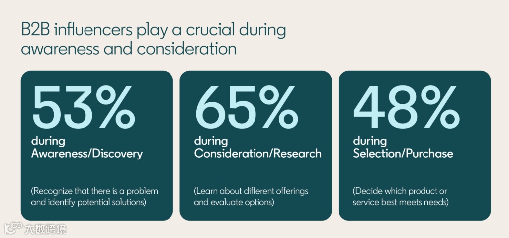 B2B影响者不仅在品牌曝光和知名度提升上发挥作用,更在消费者决策的全路径中扮演着不可或缺的角色。LinkedIn的研究显示,B2B影响者在客户的不同决策阶段都展现出了显著的影响力: