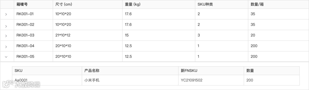 而在海外仓WMS中,货物到仓的预报一般都是箱+数量的形式预报,其中箱子内还有对应的装箱明细,也就是具体的产品+数量,例如这样: