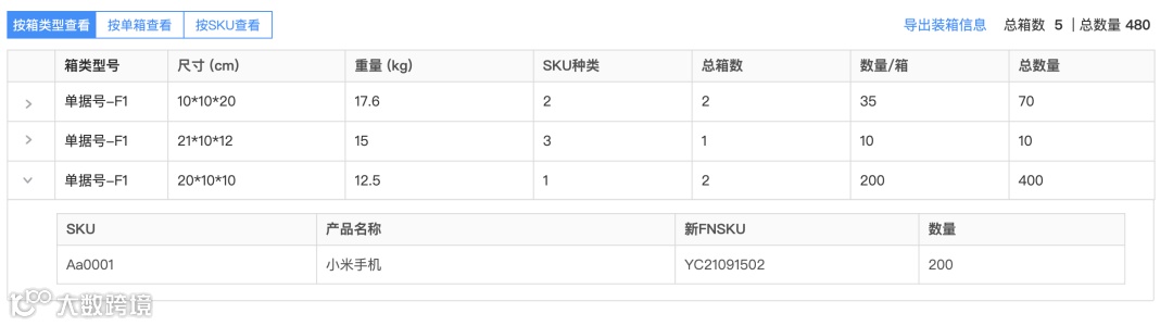 2.按单箱查看,即按箱唛号来查看,有多少箱就会有多少个箱唛号,每个箱唛号中包含的SKU分别是什么也可以看到。