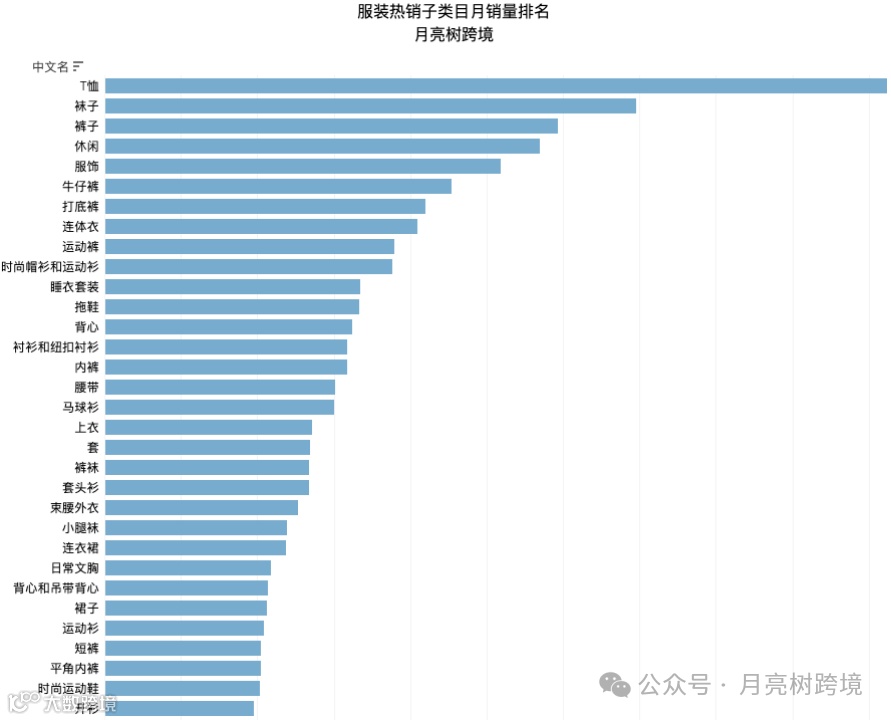 从销量来看,T恤位居榜首,远超排名第二的袜子,销售额紧随其后。此外,裤子、休闲服饰、牛仔裤、打底裤、连体衣、运动裤等表现突出。