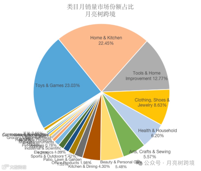 从整体销售表现看,“玩具和游戏”“家居和厨房”两个大类目的月销量均超80万件,远超第三名“工具和家居装修”的37万+销量。
