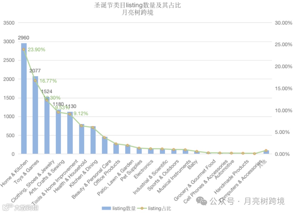 数据显示,圣诞相关商品涵盖20多个一级类目,上千个细分子类。其中,“家具和厨房”类目卖家数量最多,占比高达23.9%,市场竞争最为激烈。