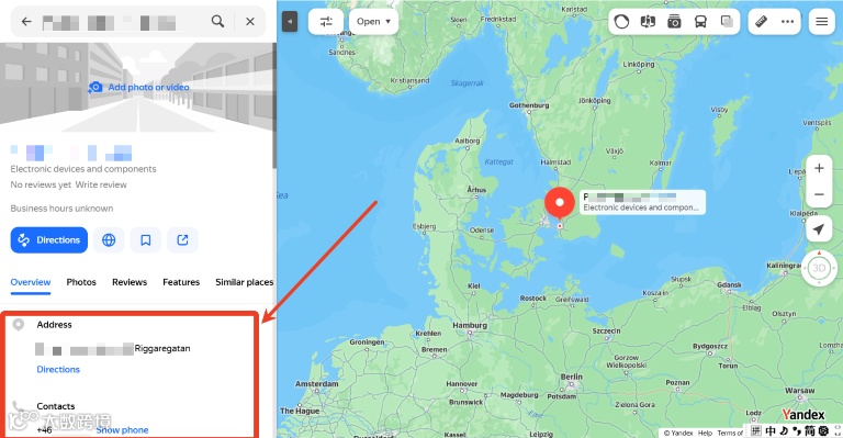 在 Yandex 地图中输入“城市 + 关键词”,即可定位目标区域内的相关企业,查看其公司名、官网、电话、邮箱及 VK 页面等信息。