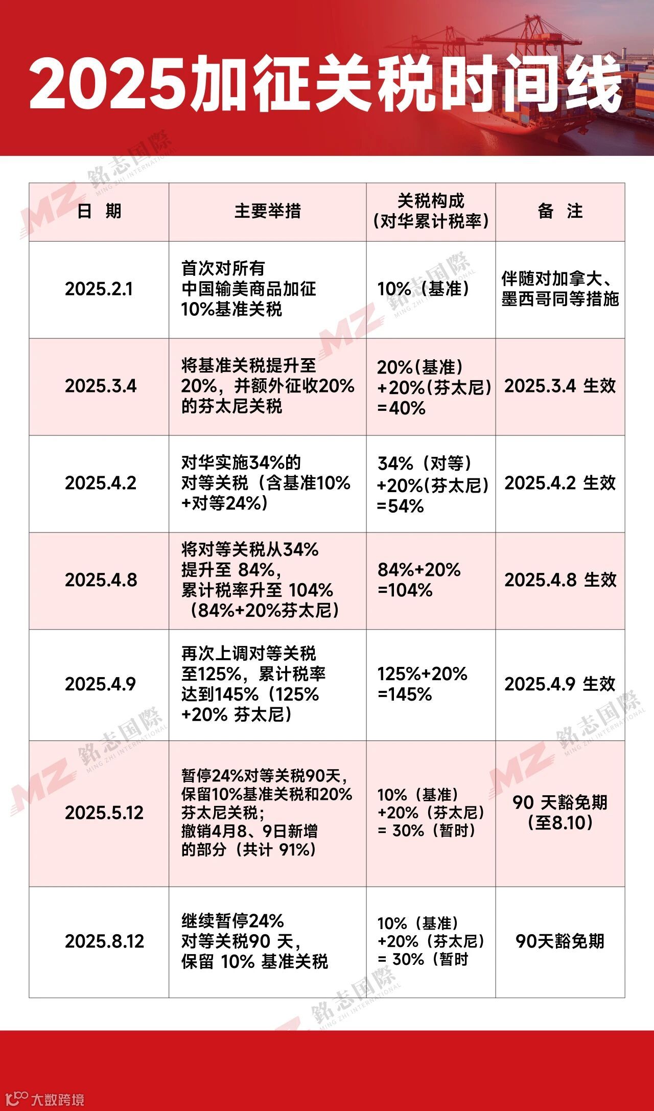 2.芬太尼关税:这是以“合成类阿片药物”问题为由,对所有中国商品额外加征的20%关税,自2024-2025年一直存在,也是适合所有商品的。