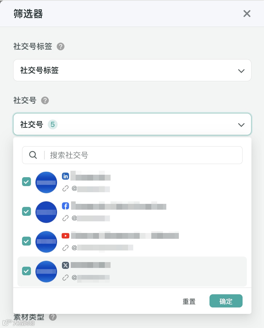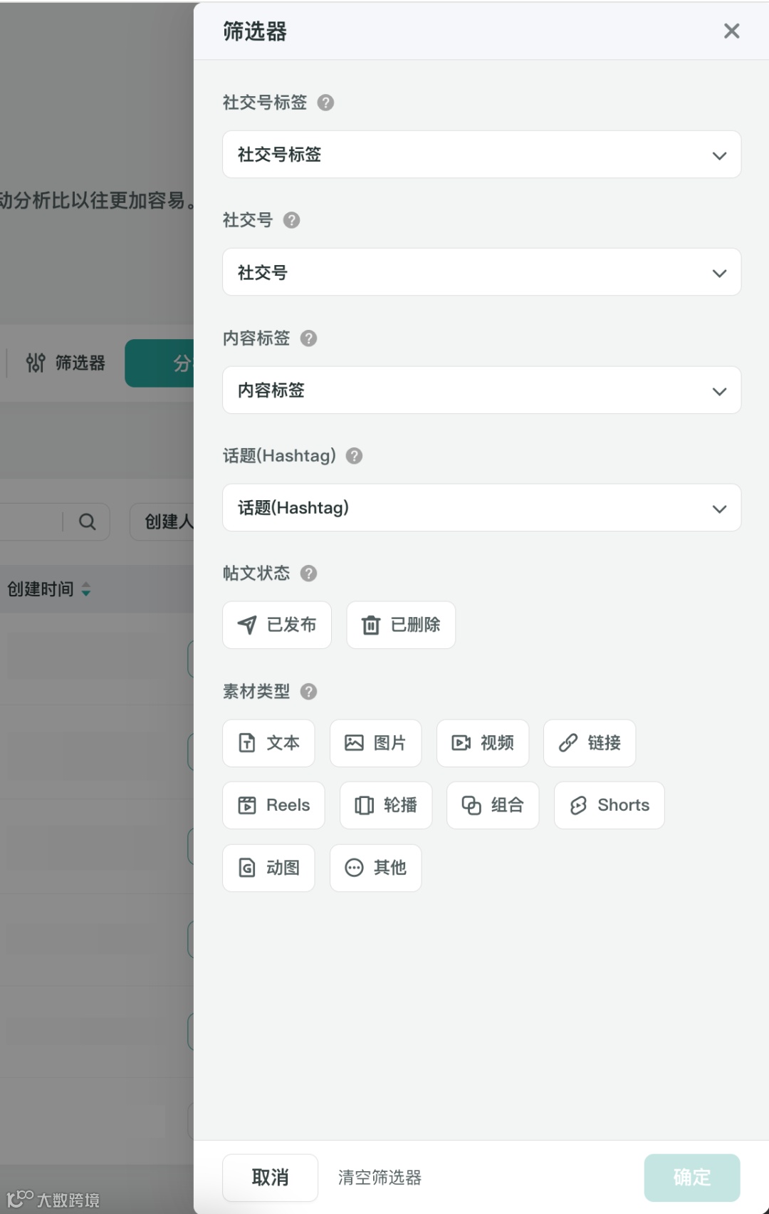 接下来,可以利用“分析”按钮左侧的“筛选器”指定特定的社交号、内容标签、素材类型等,这里根据自己实际发布的营销活动及分析需求来指定即可: