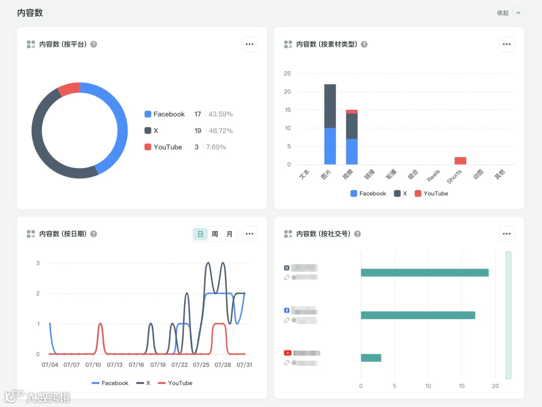 营销活动分析的数据展示和分析维度颇为丰富。以“内容数”为例,OneSight提供了按平台、按素材类型、按日期、按社交号等多个维度,更利于全面掌握社交媒体上营销活动的细化数据: