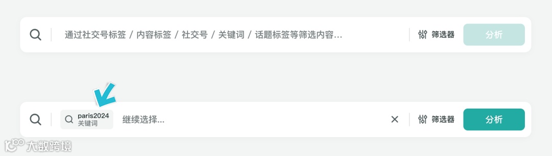 首先需要通过社交号标签/内容标签/社交号/关键词/话题标签等筛选出相关帖文内容,因为奥运营销的内容中往往会加入#Paris2024标签,我们就以指定关键词的方式,将Paris2024作为关键词。这里可以根据需要输入单个或多个关键词,以求达到更为精准的数据采集和分析:
