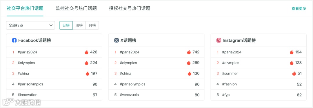 #paris2024、#olympics在Facebook、X、Instagram等海外主流社交平台的热门话题中位居榜首: