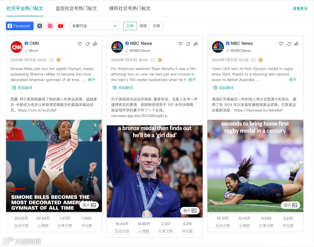 奥运会开幕不久,相关内容迅速升温,社交平台热门帖文及热门话题几乎被奥运包揽。OneSight平台的社交平台热门帖文Facebook日榜显示,排名前三的全部是奥运相关的内容: