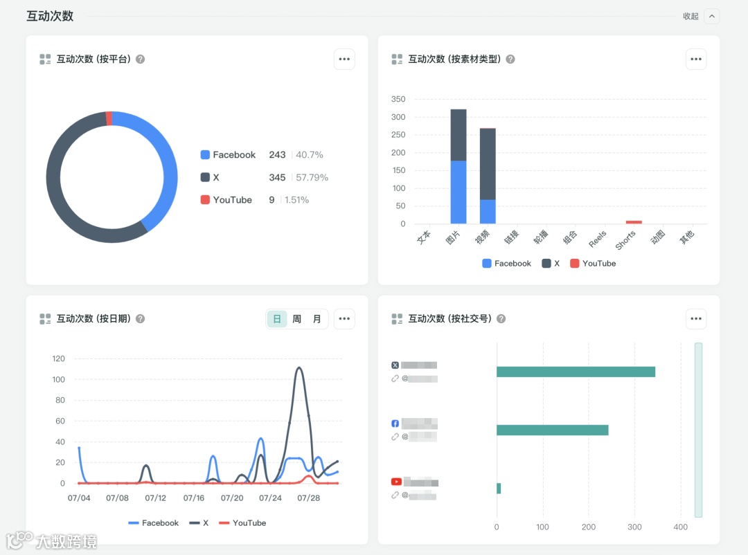 互动是海外社媒运营者关注的另一重要指标,OneSight从按平台、按素材类型、按日期、按社交号4个维度进行数据统计和分析,并以可视化图表进行展示:
