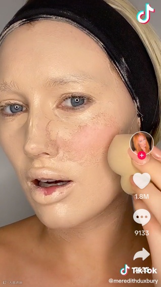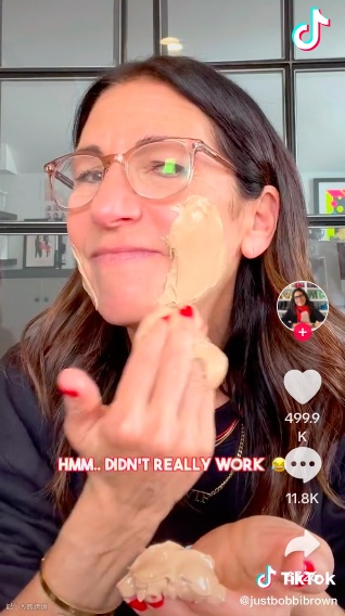 而很快,作为该品牌的创始人Bobbi Brown也在自己的TikTok上发视频回应了这件事。她选择模仿了这位美妆博主的手法,同样挖出了大量的粉底液直接上脸涂抹, 并且表示“这好像不太行”,通过生动和委婉地方式表达了该博主使用粉底的方式是错误的。