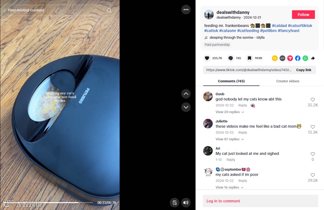 在视频创作中,他们不仅注重产品功能的演示,更强调真实使用场景的渗透,通过情境化、故事化的表达,将产品巧妙融入养宠日常,以此精准连接不同圈层的消费者,有效拉动了购买转化。