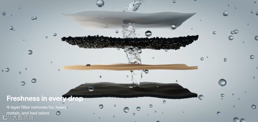 同样凭借场景化创新赢得市场的还有品牌Petlibro,其推出的智能饮水器采用四层垂直过滤系统,能有效去除杂质和重金属,并通过手机APP实现水量监测、状态提醒等智能功能。这种智能化的体验,极大地提升了用户的使用便利性和对宠物健康的关注度。