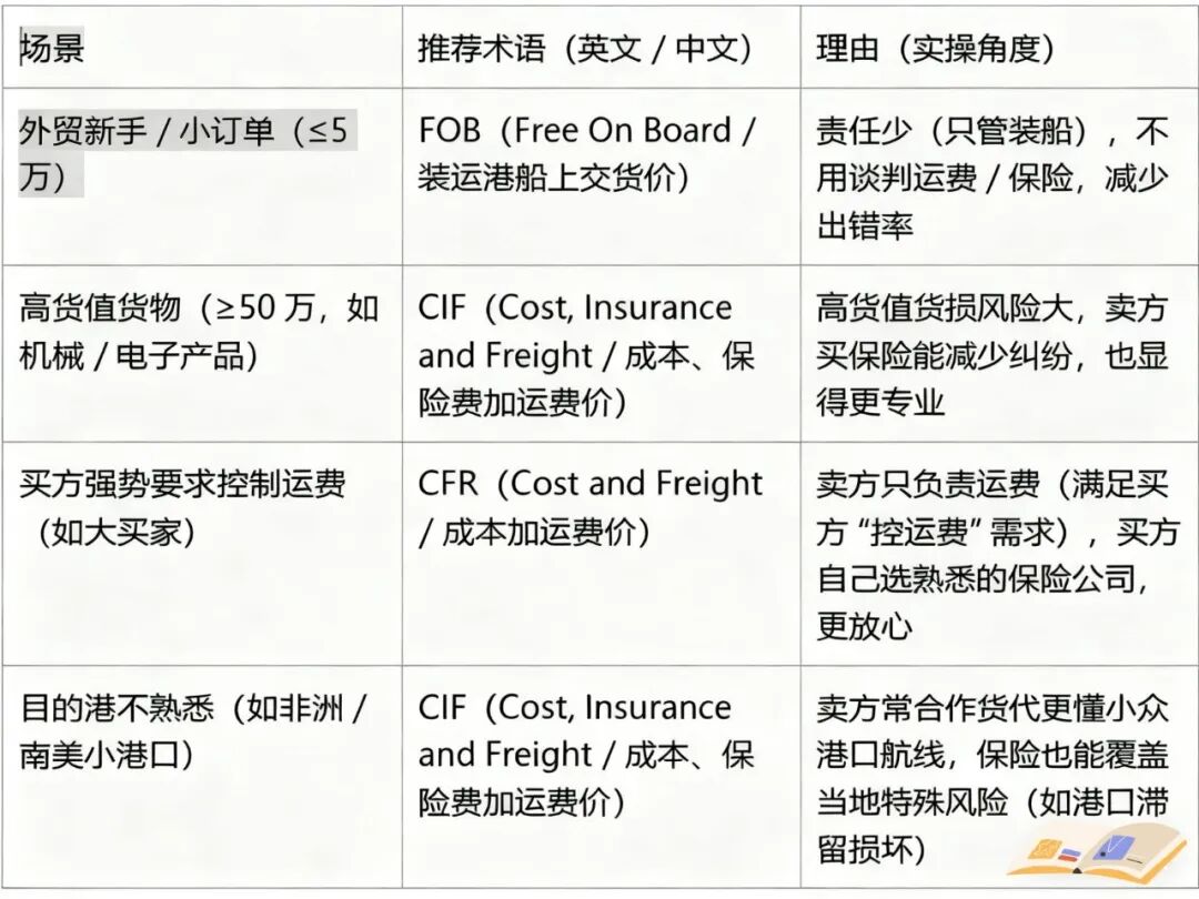 —新手优先 FOB/CIF:CFR 的 “保险衔接” 太考验配合(需卖方及时通知、买方及时投保),新手容易因沟通差出问题,先从 FOB/CIF 练手。