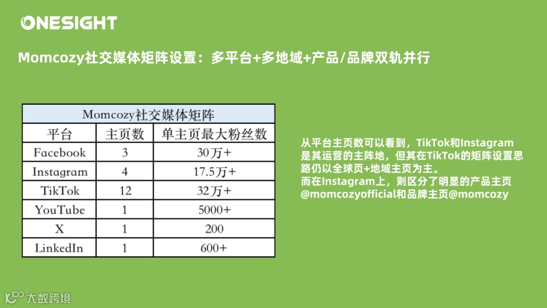 Momcozy在社交媒体主页设置上与很多品牌相同,都选择了多平台+重点地区主页的矩阵式运营。