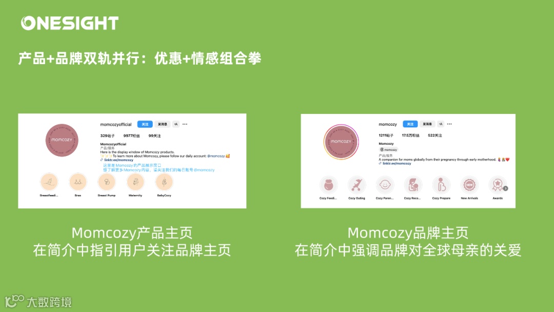 结合产后母亲们对孕哺和育儿知识的需求以及产前及产后情感连接的需求,Momcozy选择将产品和品牌的社交媒体主页拆分开,在专门的产品主页@momcozyofficial上发布产品图、使用方法以及促销优惠;而在专门的品牌主页@momcozy则主要发布育儿知识、育儿趣事和妈咪心情等引发消费者共鸣的情感类内容。