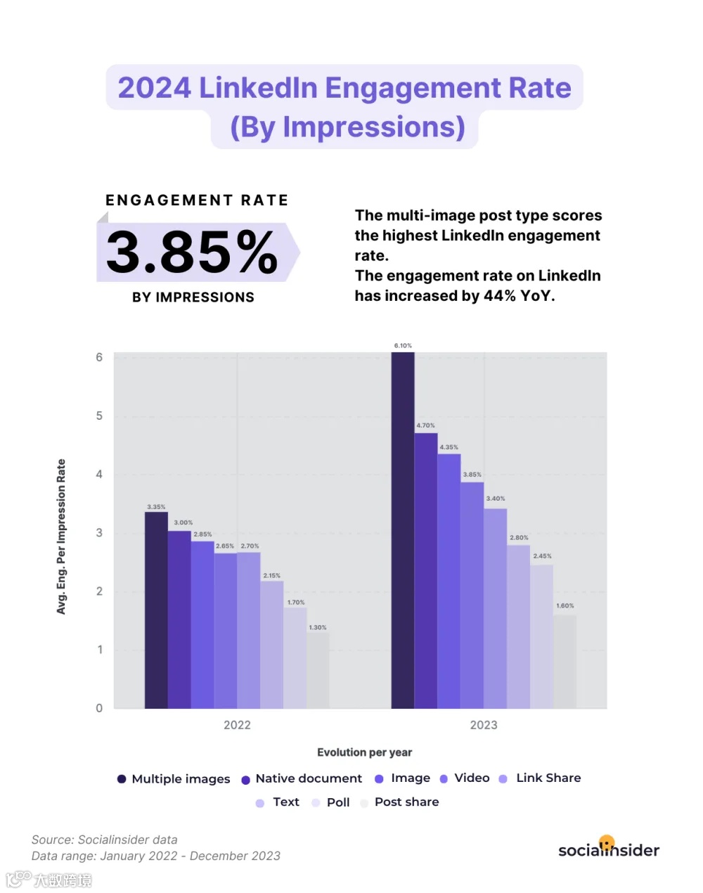 尽管视频在LinkedIn上的直接互动可能不是最高,但视频内容是LinkedIn上分享最多的内容类型。这表明观众渴望更动态、更直观的信息传递方式。品牌应投入更多资源制作高质量的视频内容,以提高品牌知名度和吸引力。通过分享有价值的视频内容,品牌可以扩大其影响力,并与受众建立更紧密的联系。