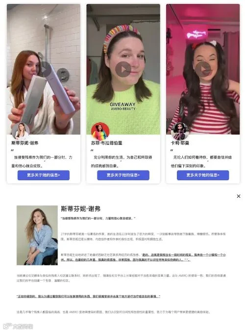 同时,在觅光官网专门为“Beauty Without Barrier”设置了专区,在这一页面消费者可以看到残疾人用户在社交媒体上发布的觅光相关产品的真实试用体验,点击视频下面的按钮还可以看到这位用户的故事和生活感悟,以更深入地诠释“无界之美”。
