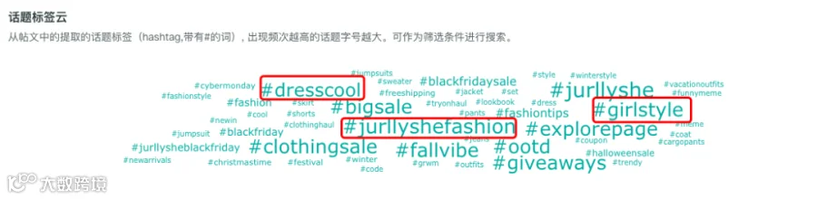 比如当我们通过OneSight营销云集中查看Jurllyshe在Q4社交媒体上常使用的话题标签,可以看到除了品牌词#jurllyshe和促销词汇#bigsale等之外,其常用的还有表达时尚穿衣方式和生活方式的#dresscool和#girlstyle这类的词汇。