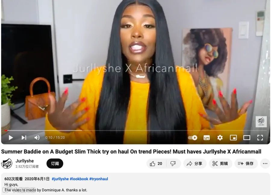 以Africanmall为品牌名进行传播的内容持续到了2020年左右——2020年的服饰试穿视频中使用的logo仍然为Africanmall,但视频中的内容已经开始介绍“Jurllyshe”这个品牌。