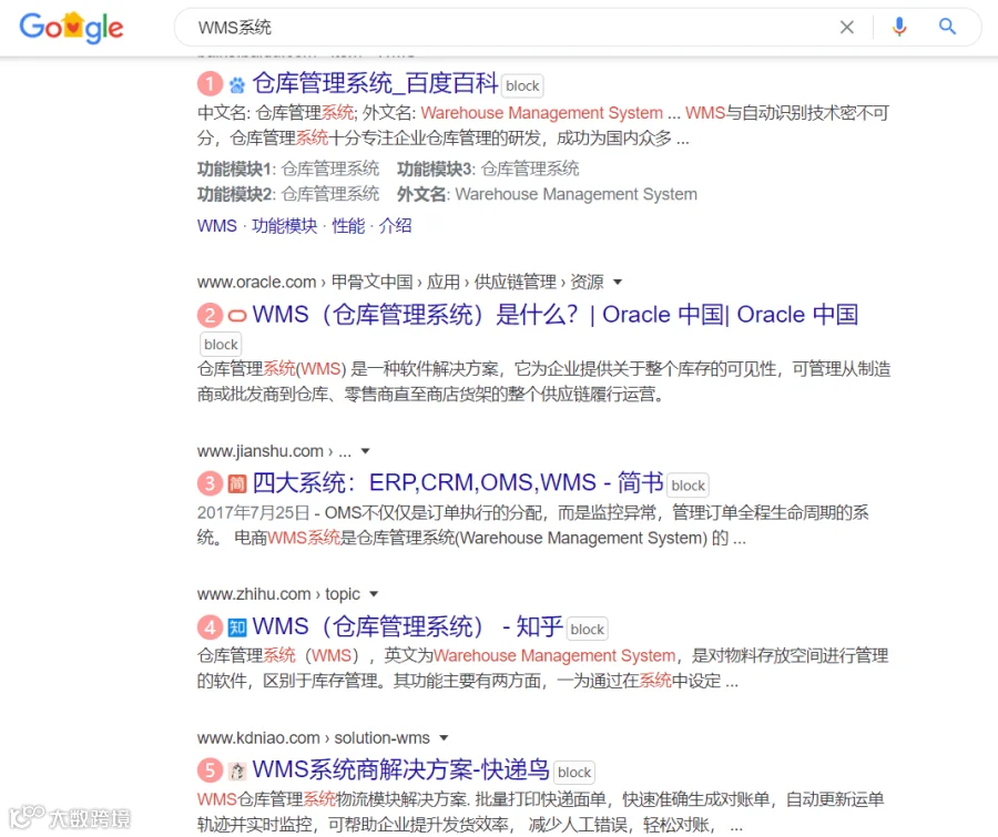 例如同样是搜索WMS系统,对比一下百度和Google的内容,就会发现一些差异。