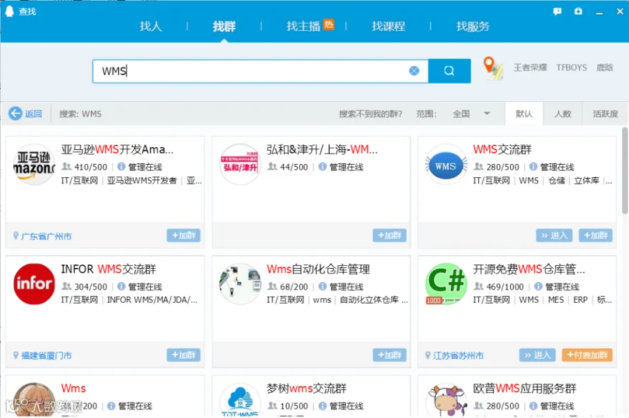 当我刚开始接触WMS的时候,我第一想到的就是先加个QQ群看看,有没有什么好的学习资料或者能拓展见识的。打开QQ,搜索QQ群,然后输入关键词,什么竞品,还是行业交流群等都跃然而出。