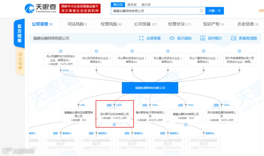 当时不知从哪里有了解福建一家公司叫做纵腾,然后他们下面的某个公司做「一件代发」的业务挺多的,但是具体他们的产品或者是系统是什么我一直都不知道。后来机缘巧合之下我去查了一下天眼查的信息,无意中在控股资料这一块看到了一个有点眼熟的公司——深圳市易可达科技有限公司,这个公司似乎好像也是做海外仓业务的, 然后我就顺着这根线查了一下,发现他们家的产品是谷仓。