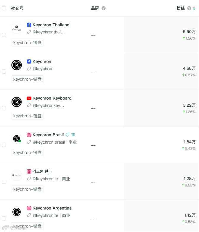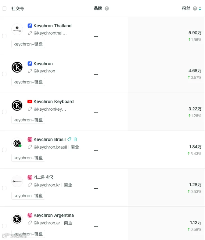 (图为通过OneSight营销云后台收集的Keychron部分地区社媒主页截图。图片来源:OneSight营销云后台;数据来源:各社交媒体主页的公开数据。)